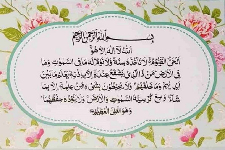 Allahu la ilaha illa huw, al-hayyul-qayyum, la ta’khudzuhu sinatuw wa la na’um, lahu ma fis-samawati wa ma fil-ardl, man dzalladzi yasyfa‘u ‘indahu illa bi’idznih, ya‘lamu ma baina aidihim wa ma khalfahum, wa la yuhithuna bisyai’im min ‘ilmihi illa bima sya’, wasi‘a kursiyyuhus-samawati wal-ardl, wa la ya’uduhu hifdhuhuma, wa huwal-‘aliyyul-‘adhim