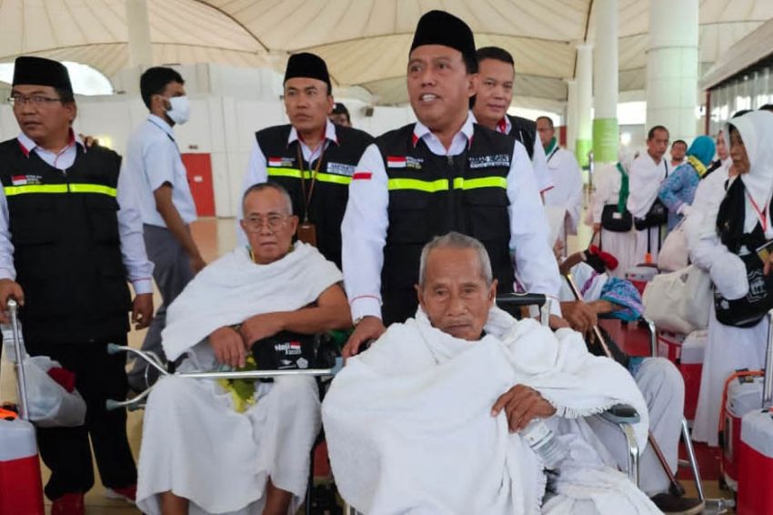 Direktur Bina Haji Kemenag Arsad Hidayat mendorong jemaah haji Indonesia yang baru mendarat di Bandara Internasional King Abdul Aziz Jeddah, Arab Saudi, Kamis (8/6/2023). FOTO/MCH