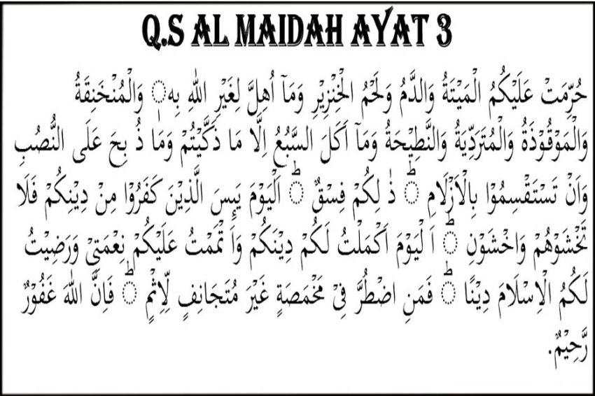 hurrimat ‘alaikumul-maitatu wad-damu wa lahmul-khinziiri wa ma uHilla lighairillahi bihi wal-munkhaniqatu wal-mauqudzatu wal-mutaroddiyatu wan-nathihatu wa maaa akalas-sabu’u illaa maa dzakkaitum, wa ma dzubiha alan-nushubi wa an tastaqsimu bil-azlaam(i), Dzaalikum fisq(un), al-yauma ya-isalladzina kafaruu min diinikum fala takhsyauhum wakhsyaun(i), al-yauma akmaltu lakum diinakum wa atmamtu ‘alaikum ni’matii wa radhiitu lakumul-Islaama diina(n), fa manidh-thurra fi makhmashatin ghaira mutajaanifil li’ism(in), fa innallaaha ghafuurur rahiim.