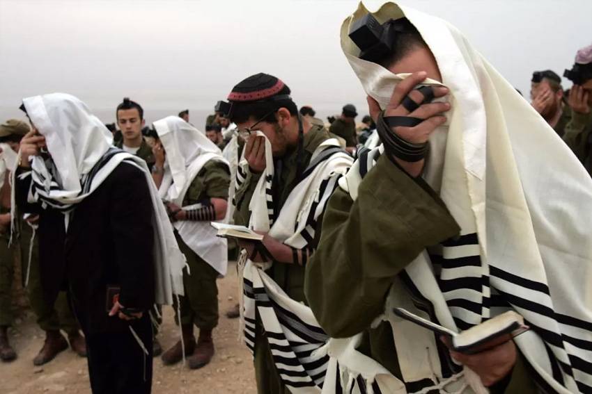 Tentara Israel dari batalyon ultra-Ortodoks Netzah Yehuda berdoa di puncak benteng kuno Masada, 23 Maret 2007. Ilustrasi: MEE