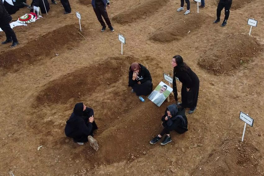 Para pelayat berkumpul di sekitar kuburan saat pemakaman massal korban Yazidi oleh ISIS pada 6 Februari 2021 (MEE)