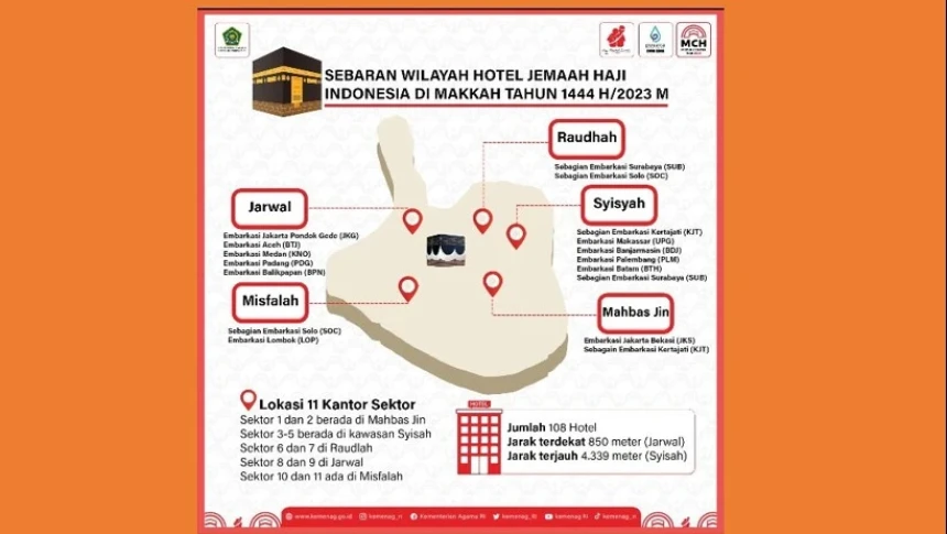 Pada musim haji 1444 H/2023 M ini terdapat 108 hotel yang akan menjadi tempat tinggal jamaah haji Indonesia selama di Kota Makkah. Hotel ini terbagi dalam 11 sektor dan 1 sektor khusus Masjidil Haram. Jarak terdekat dari hotel ke Masjidil Hatam sekitar 850 meter, sedang jarak terjauh sekitar 4.300 meter.