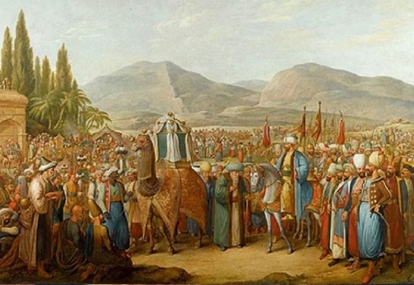Penggambaran awal abad ke-19 tentang prosesi Haji Ottoman oleh seniman Georg Manuel Lopiz. (MEE)