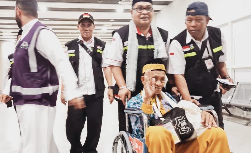 JAKARTA – Mbah Harun bin Senar, jemaah haji tertua Indonesia berusia 119 tahun asal Kecamatan Proppo, Pamekasan, Madura, tiba di Bandara Internasional Amir Muhammad Bin Abdul Aziz (AMAA), Jumat (26/5/2023). Dia menginjakkan kaki di bandara sekitar pukul 1.10 Waktu Arab Saudi (WAS) dalam keadaan sehat, termasuk dalam rombongan 450 jemaah haji Kloter 6 Surabaya (SUB).
