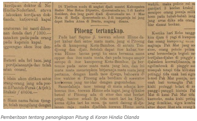 “Dalam hari-hari ini polisi telah dapet kabar. Bahawa itu orang hukuman mati bernama Pitoeng, yang telah minggat dari penjara, hendak kabur dengan mengikut kapal mail Prasman dan berpakaian seperti perempuan. Dua pegawai polisi yang berpakaian preman, disuruh cegat pelari itu; tapi pelari itu tidak terdapet di antara orang-orang yang (hendak) pergi berlayar dengan itu kapal, tulis Hindia Olanda edisi 12 Mei 1893. ( )