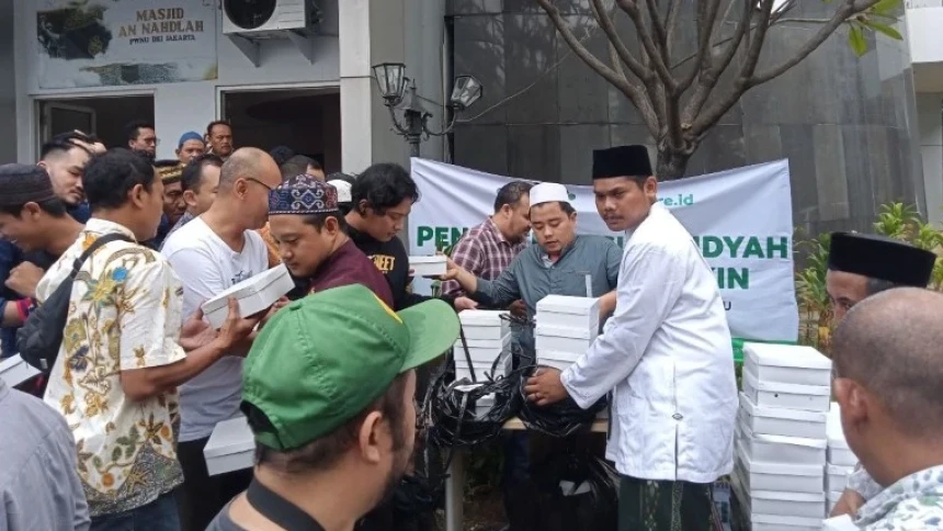 Pembagian makanan dalam program Jumat Berbagi NU Care-LAZISNU menyapa jamaah Masjid An-Nahdlah PWNU DKI Jakarta, Jumat (11/8/2023).